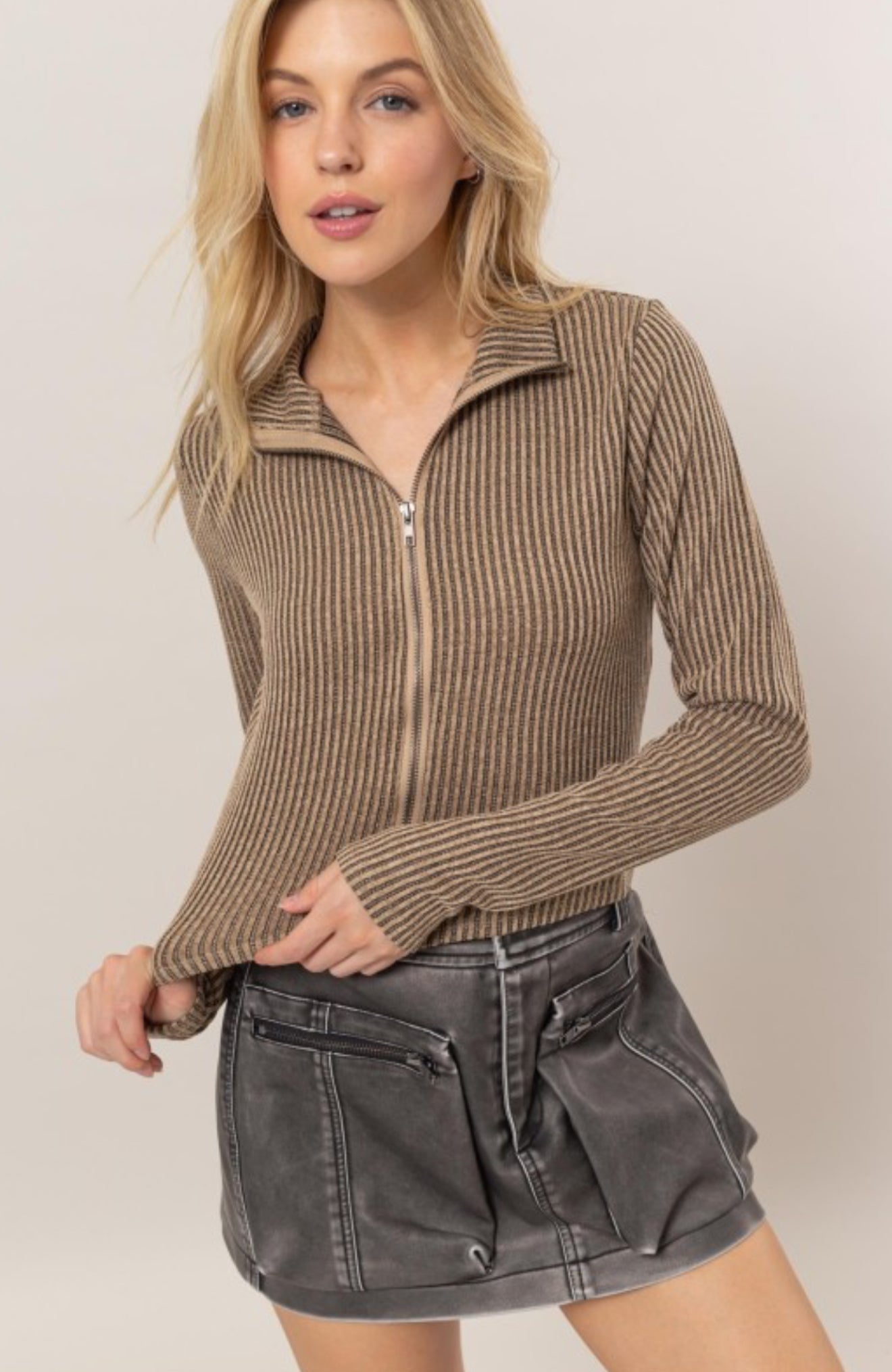A taupe ribbed zip up long sleeve cardigan with collar. Wear it open layered or zipped closed as a shirt.
