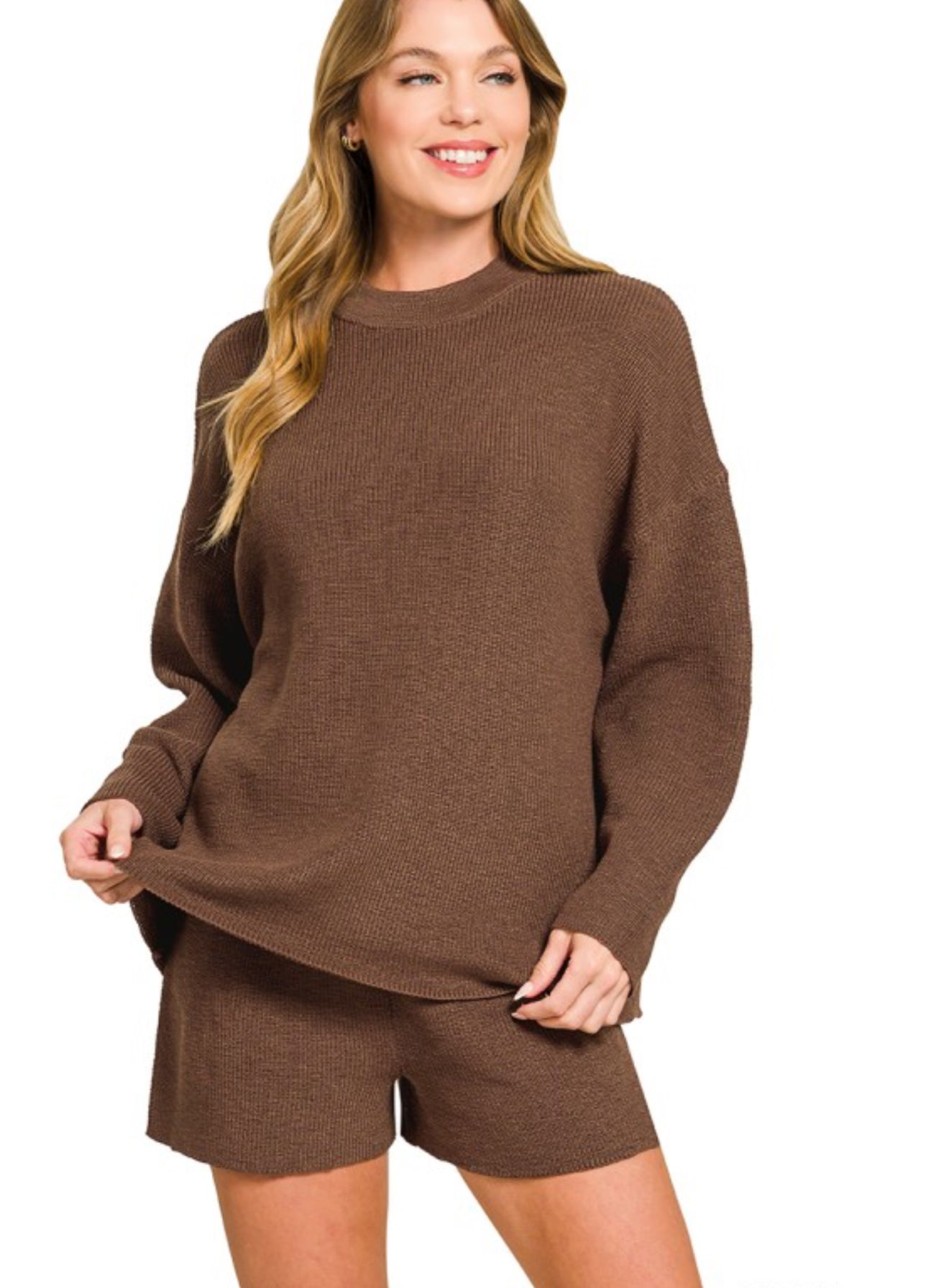 A beautiful brown long sleeve sweater and short set. Stretch waist band. Amazing material to dress up or down.